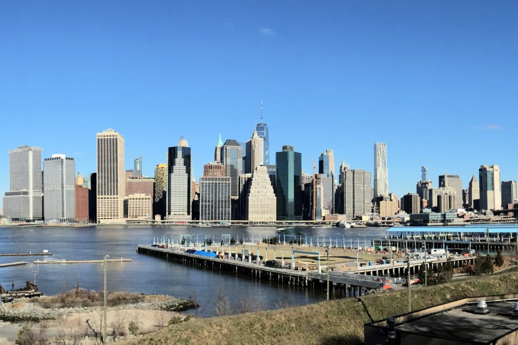 少し歩いてイースト川沿いに出るとマンハッタンの高層ビル群が見渡せます。